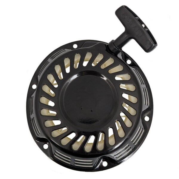 Universal Parts aftermarket pullstarter for minibikes with 196cc 6.5hp engines, including the Coleman BT200X, CT200U Trail, and CT200U-EX. Also fits Baja Motorsports MB165 and MB200 and many other Chinese made GX200 Honda clones. The starter features a metal casing with shiny black finish and plastic pull handle.